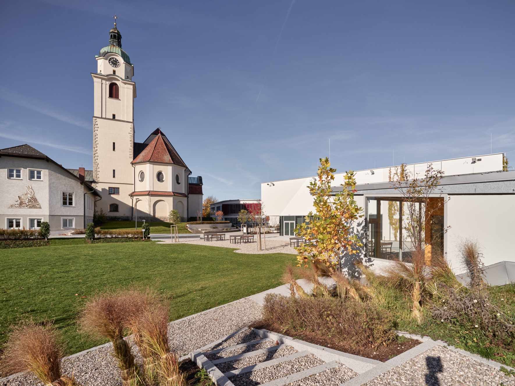 Mit Neubauten wird versucht die bestehende Struktur zu ergänzen um eine interessante Platzfolge entstehen zu lassen. Eine winkelförmige große Struktur wird gestaltet die eine Verbindung von der Voralpen Strasse bis zur Schulstrasse darstellt und alle wichtigen Funktionen (Gemeindeamt samt Veranstaltungssaal für 270 Personen, Kirche, Krabbelstube, Bibliothek, Geschäfte bzw. Café) beinhaltet. Somit entsteht ein Marktplatz, ein Kirchenplatz, ein Park und eine parkähnliche Zugangssituation. Der freie Blick auf die Kirche bzw. das Gemeindezentrum von der Voralpen Strasse aus bleibt erhalten. Der Neubau wird dem bestehenden Gemeindeamt zugeordnet. Das neue Gemeindezentrum bildet als gestalterische Einheit einen Abschluss des neuen Platzes.