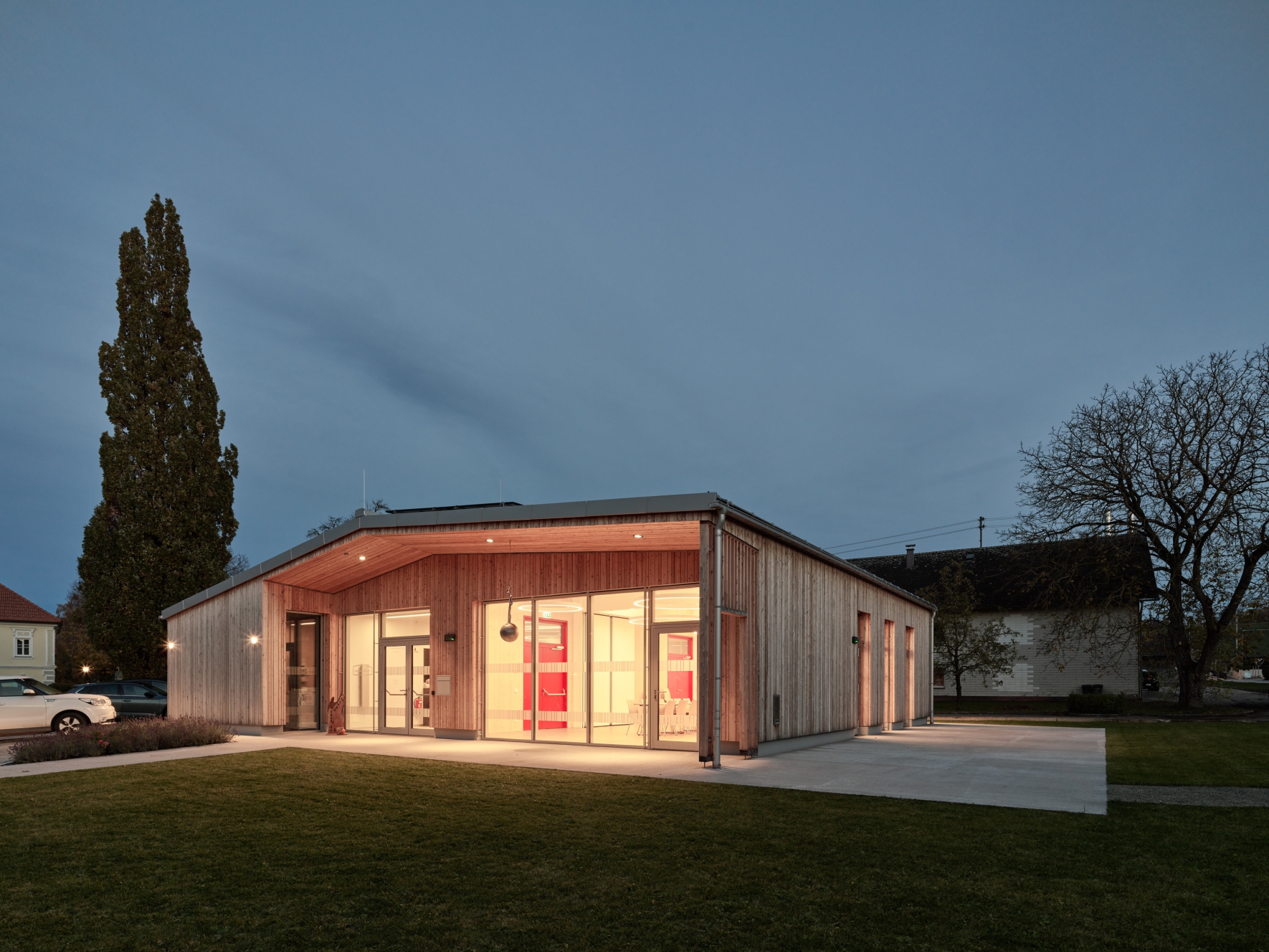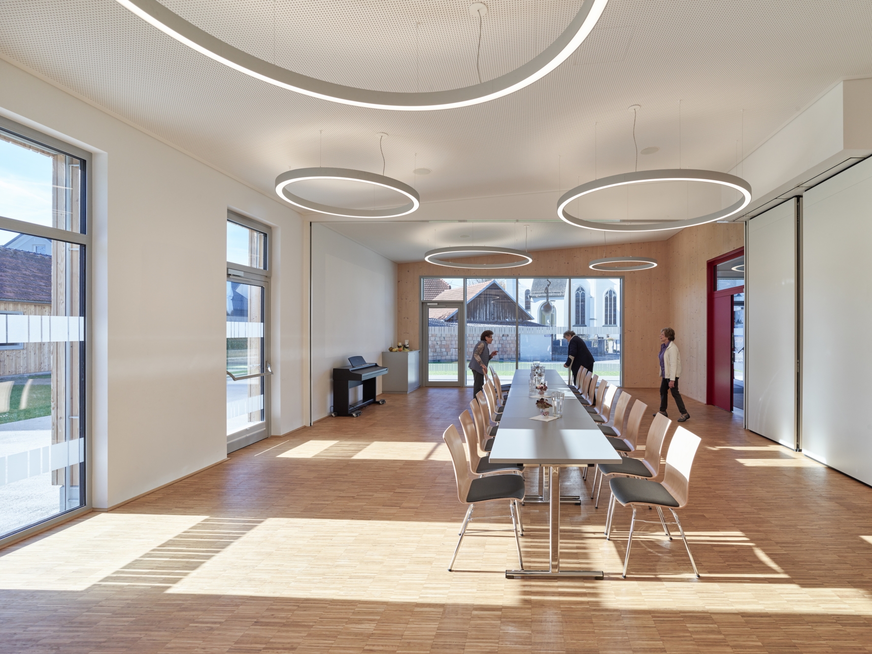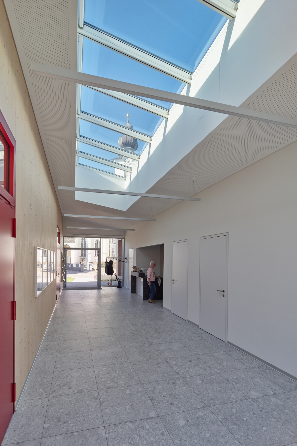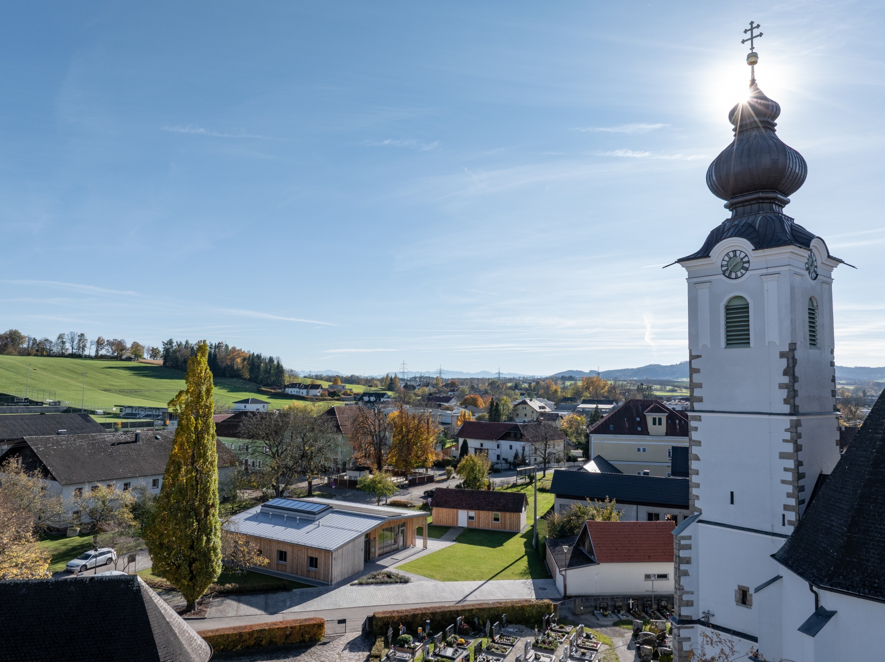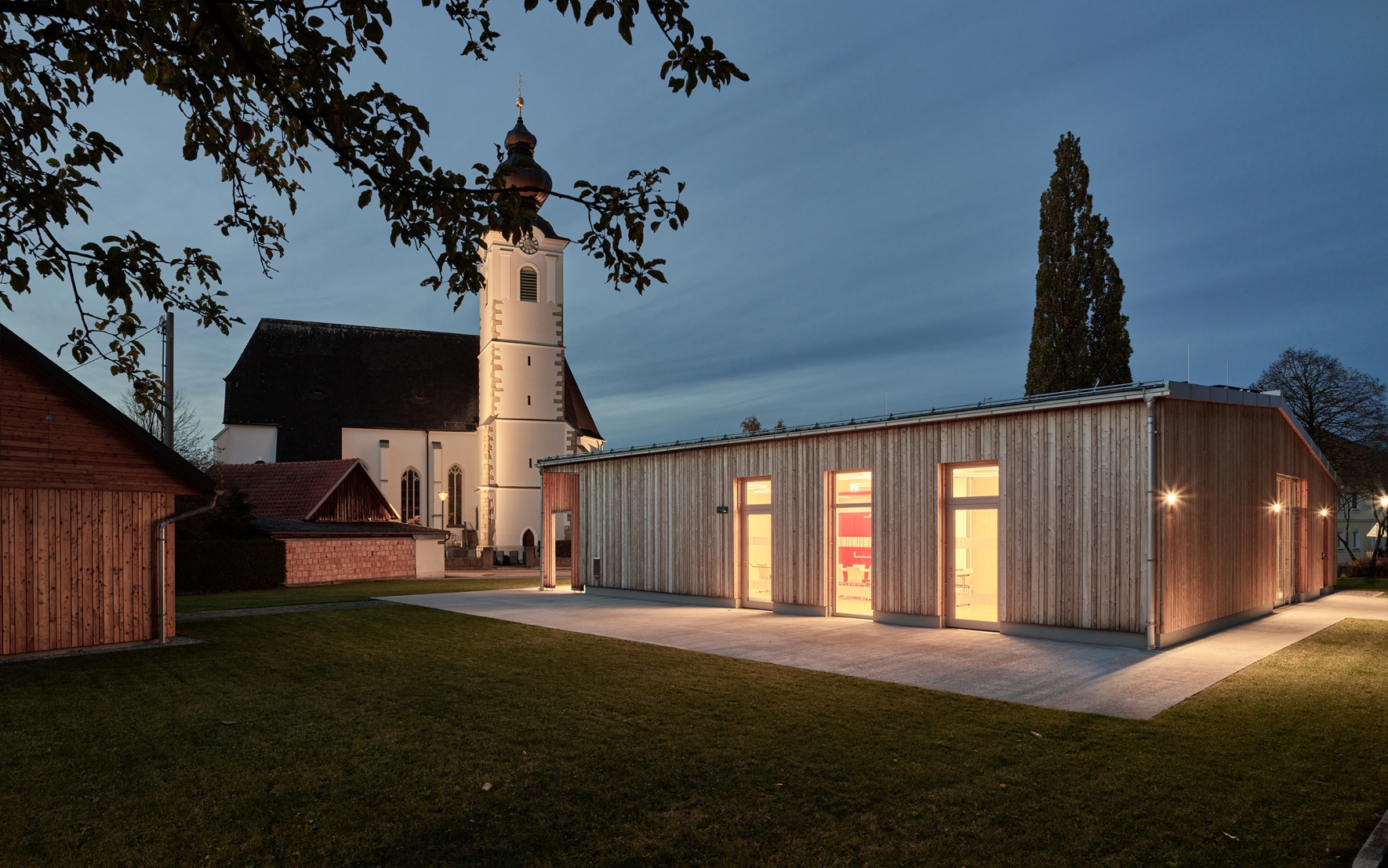 Das neue Pfarrzentrum wird als ungerichteter, neuer solitärer Baukörper als Zentrum der Begegnung für alle wahrgenommen und bildet eine Platzentwicklung an der Kirchengasse, sowie einen definierten Strassenraum zum Sportplatzweg. Der Haupteingang gegenüber des Kircheneinganges ist eine eindeutige Adressbildung. Das Gebäude spannt mit den umliegenden Gebäuden, insbesondere dem Kirchengebäude, einen Marktplatz auf.