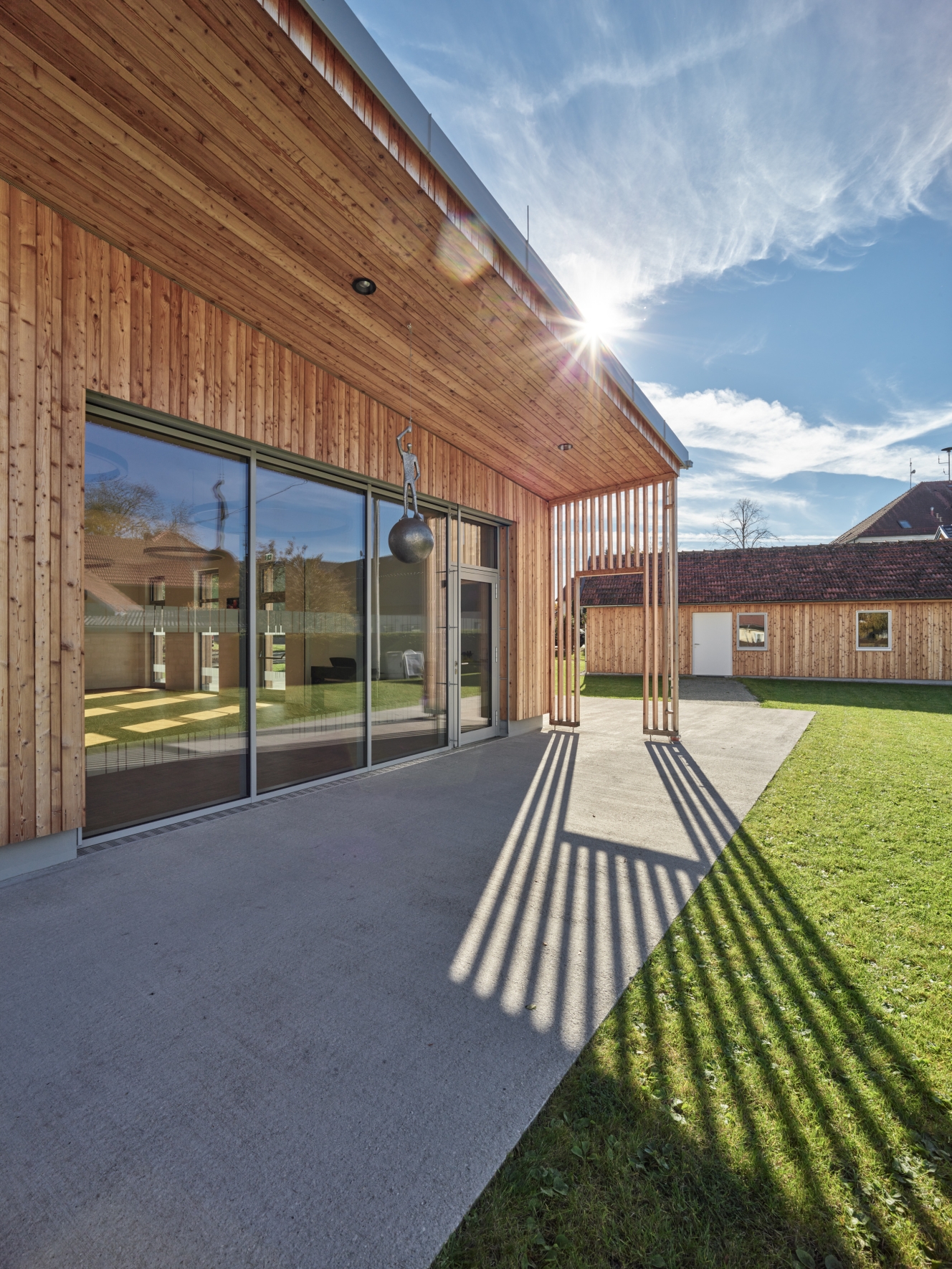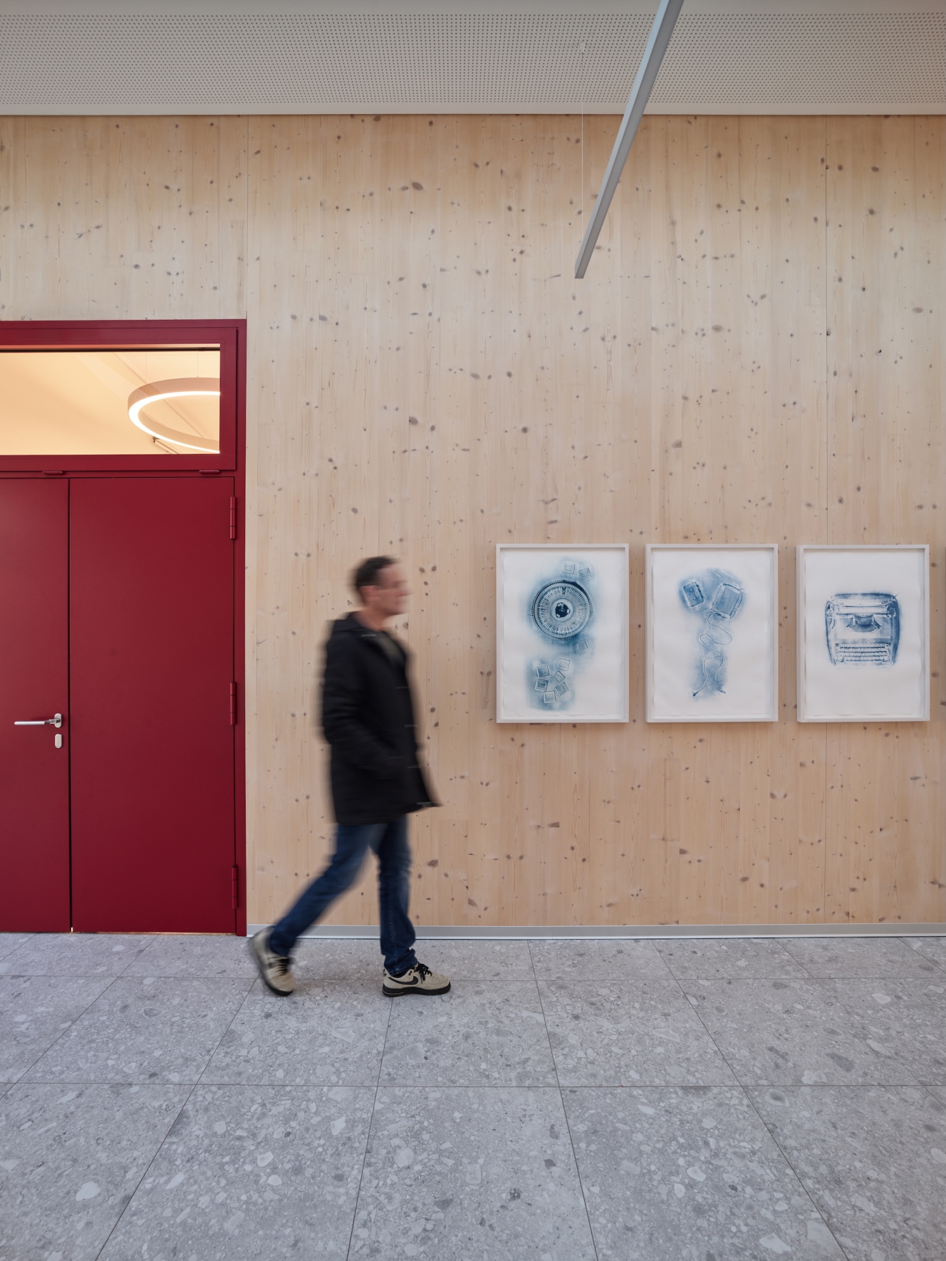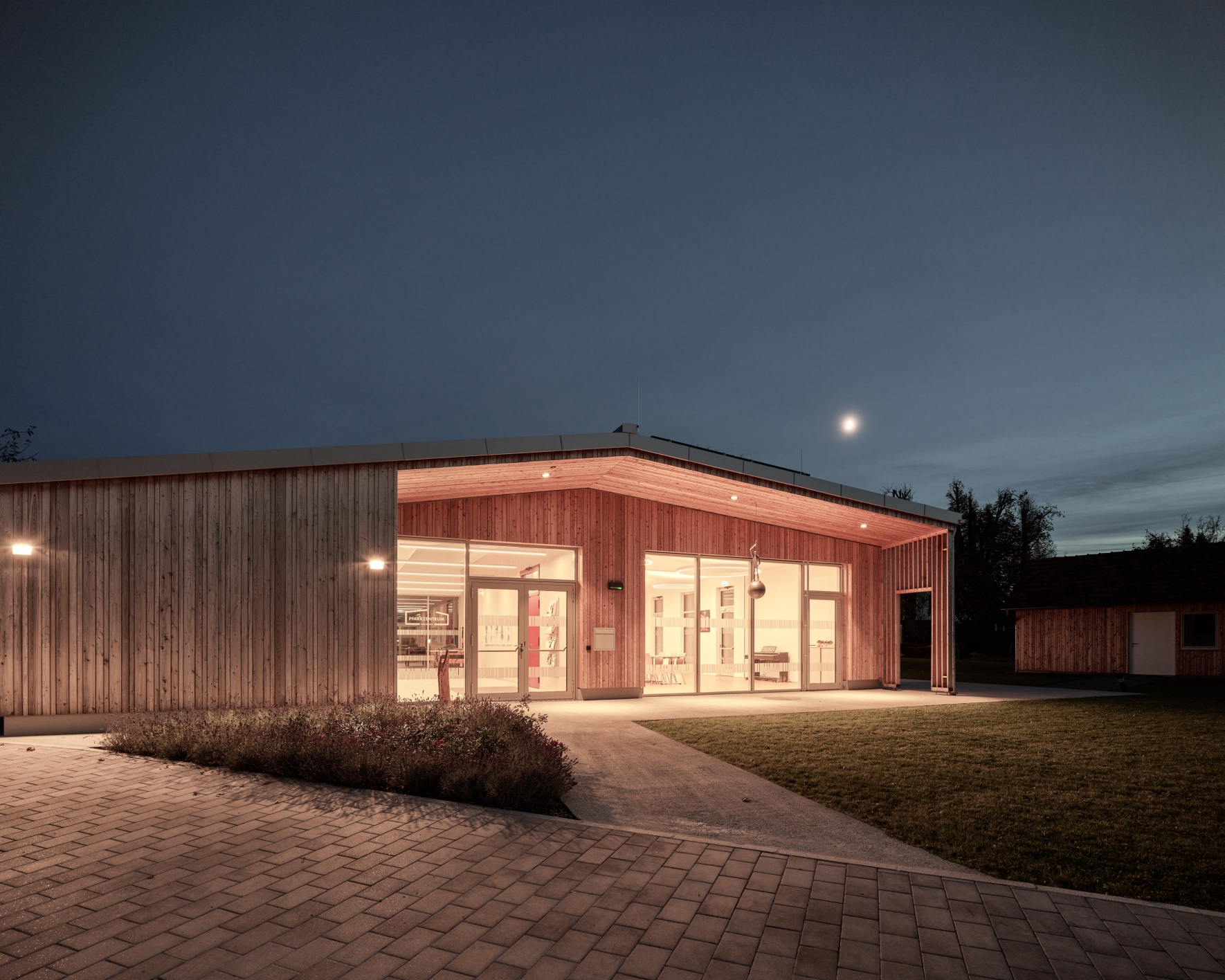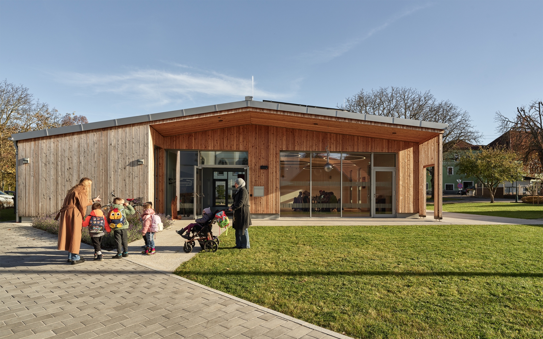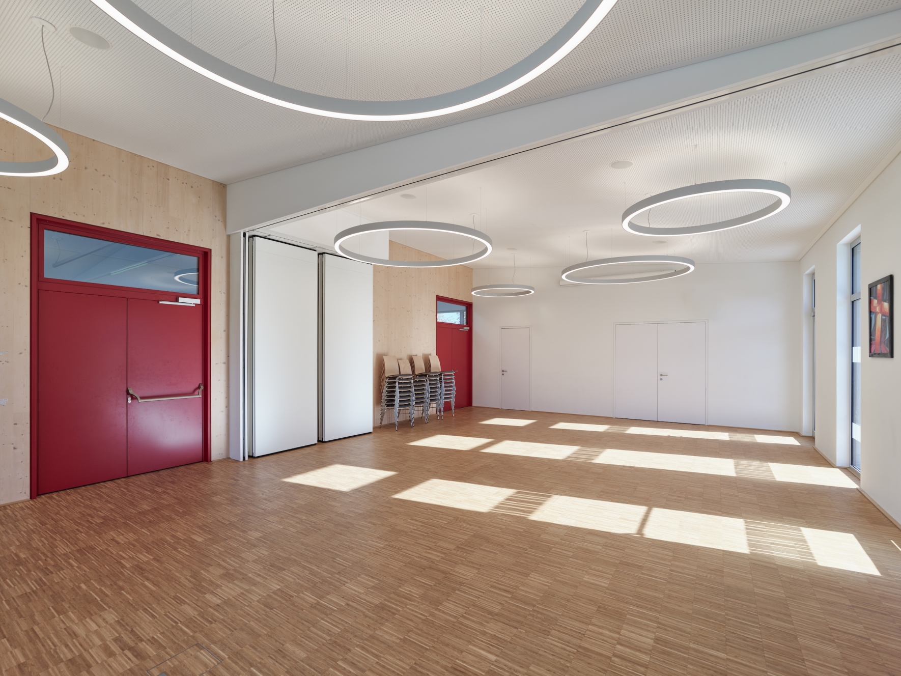 Das neue Pfarrzentrum wird als ungerichteter, neuer solitärer Baukörper als Zentrum der Begegnung für alle wahrgenommen und bildet eine Platzentwicklung an der Kirchengasse, sowie einen definierten Strassenraum zum Sportplatzweg. Der Haupteingang gegenüber des Kircheneinganges ist eine eindeutige Adressbildung. Das Gebäude spannt mit den umliegenden Gebäuden, insbesondere dem Kirchengebäude, einen Marktplatz auf.