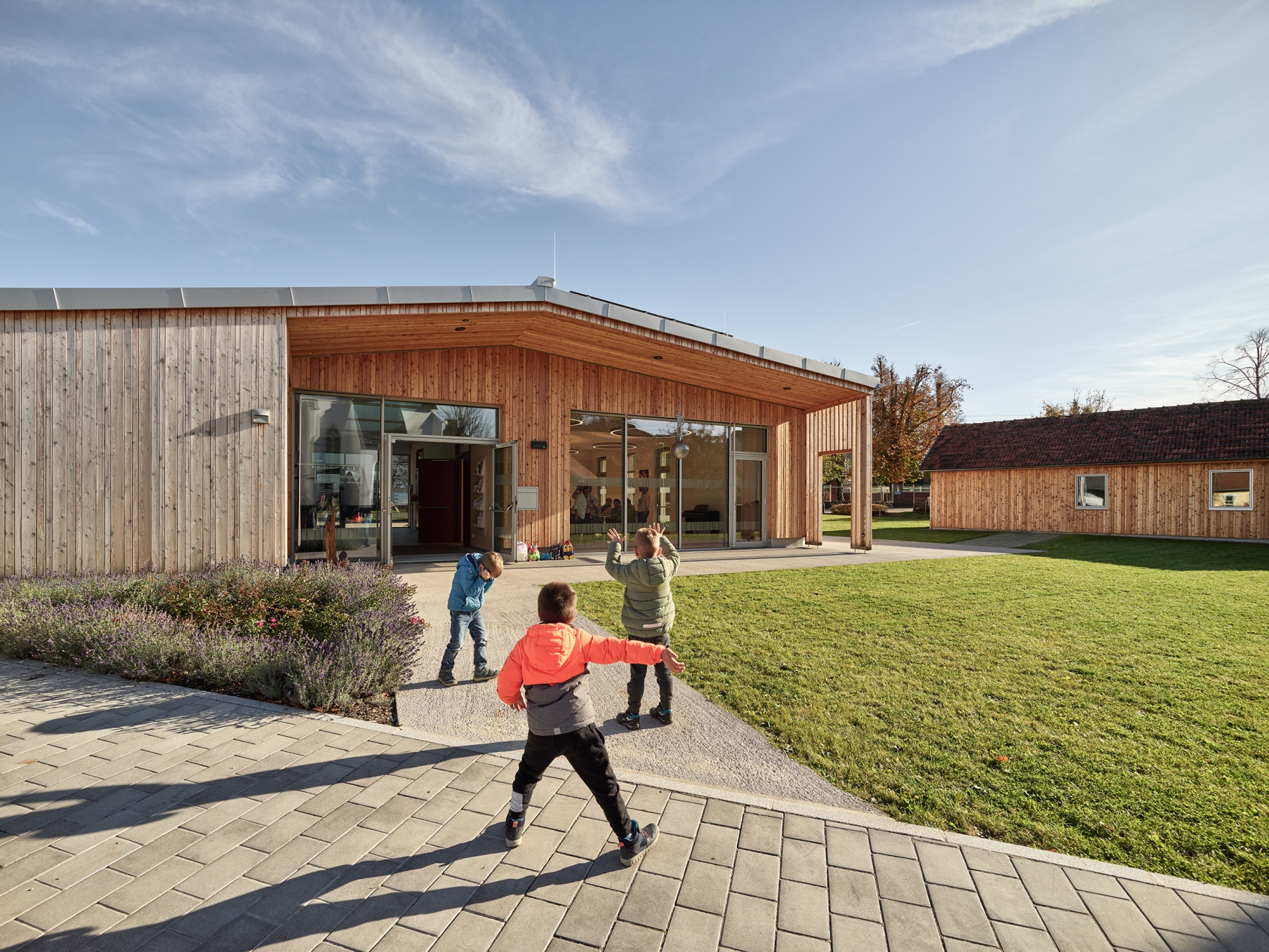 Der Marktplatz umspielt das Gebäude, das sich in alle Richtungen öffnet und das Zentrum definiert. Teilweise Rücksichtnahme auf bestehenden Baumbestand bildet mit Neupflanzungen einen Obstgarten und Mischung aus befestigten und unbefestigten Flächen entstehen.